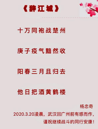 驰援湖北以前,杨忠奇为疫情防治开出了诊疗“千金方”,他在粤牵头开展的“大剂量痰热清注射液治疗新型病毒感染肺炎临床研究”项目,在国家卫健委颁布的《新冠肺炎诊疗方案(第六版)》中被采纳为临床诊疗指南。