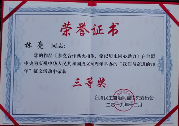 6月14日,台湾民主自治同盟广东省第八届委员会第四次全体会议在省民主大楼召开,台盟广东省委会常委、我校校办副主任林亮同志荣获2019年度“台盟广东省委员会参政议政工作先进个人”荣誉称号。此外,林亮同志撰写的论文《多党合作薪火相传,铭记历史同心协力》,在台盟中央为庆祝中华人民共和国70周年举办的“我们与奋进的70周年”征文活动中荣获三等奖。