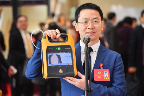 2019年丁邦晗委员现场展示、现身说法,现场举起被称为 “救命神器”体外自动除颤器(AED)并演示其使用方法—为呼吁加强公众急救方法和AED使用宣传。
