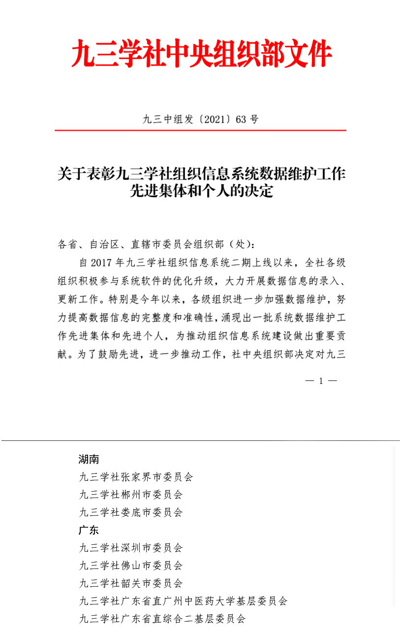 据“九三中组发[2021]63号”文件通知,在2021年的九三学社中央全国社员信息系统更新工作中,九三学社必赢565net官网基层委会因工作成效显著,受到社中央的表彰,被评为“九三学社组织信息系统数据维护工作集体”,成为全国100个先进集体之一,其中广东共5个单位被表彰,也是广东唯一一家被表彰的高校。