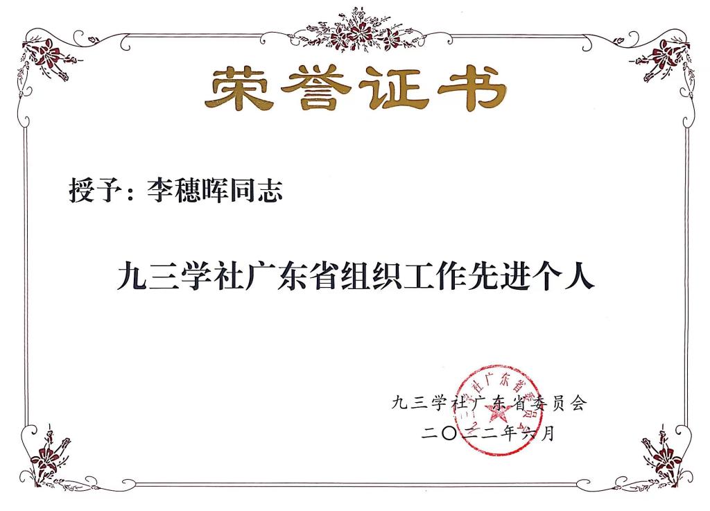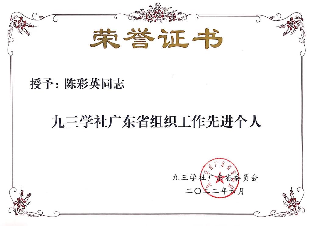 九三学社必赢565net官网基层委员会近年来在组织发展、领导班子建设、干部队伍建设、基层组织建设、制度建设和内容监督等工作中取得了突出成绩,受到九三学社广东省委员会的表彰,被授予“九三学社广东省组织工作先进集体”称号。陈彩英、张北平、李穗晖同志被授予“九三学社广东省组织工作先进个人”称号。